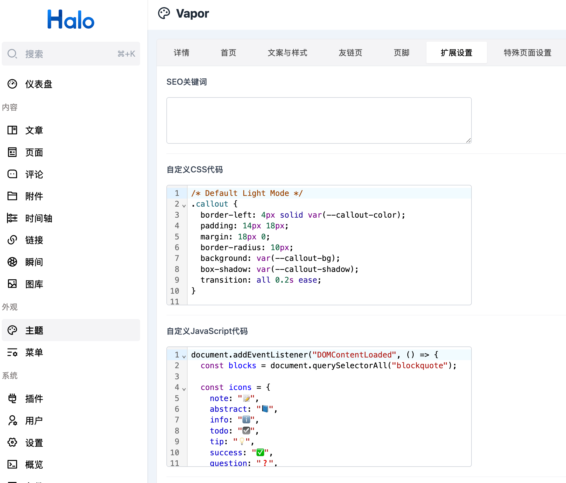选择喜欢的样式,在如图所示的主题扩展设置中粘贴并保存对应代码: