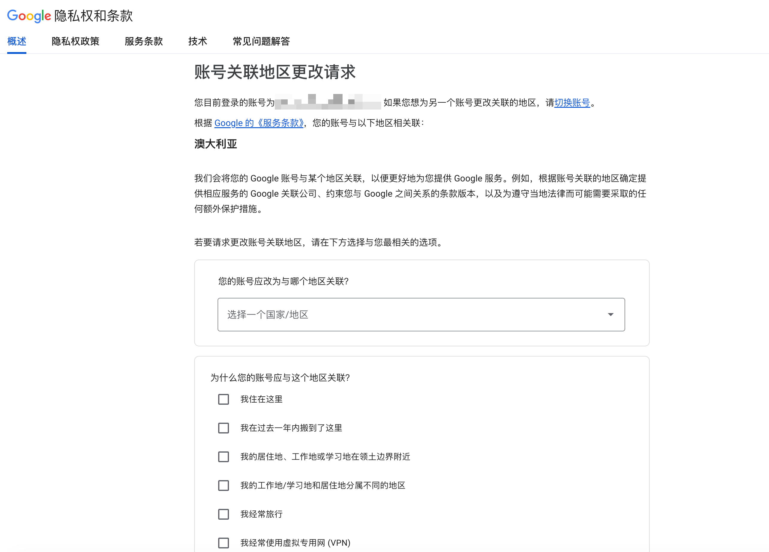 打开 https://policies.google.com/country-association-form 这个链接,登录要更改地区的 Google 账号,你会看到如下图所示的表单;