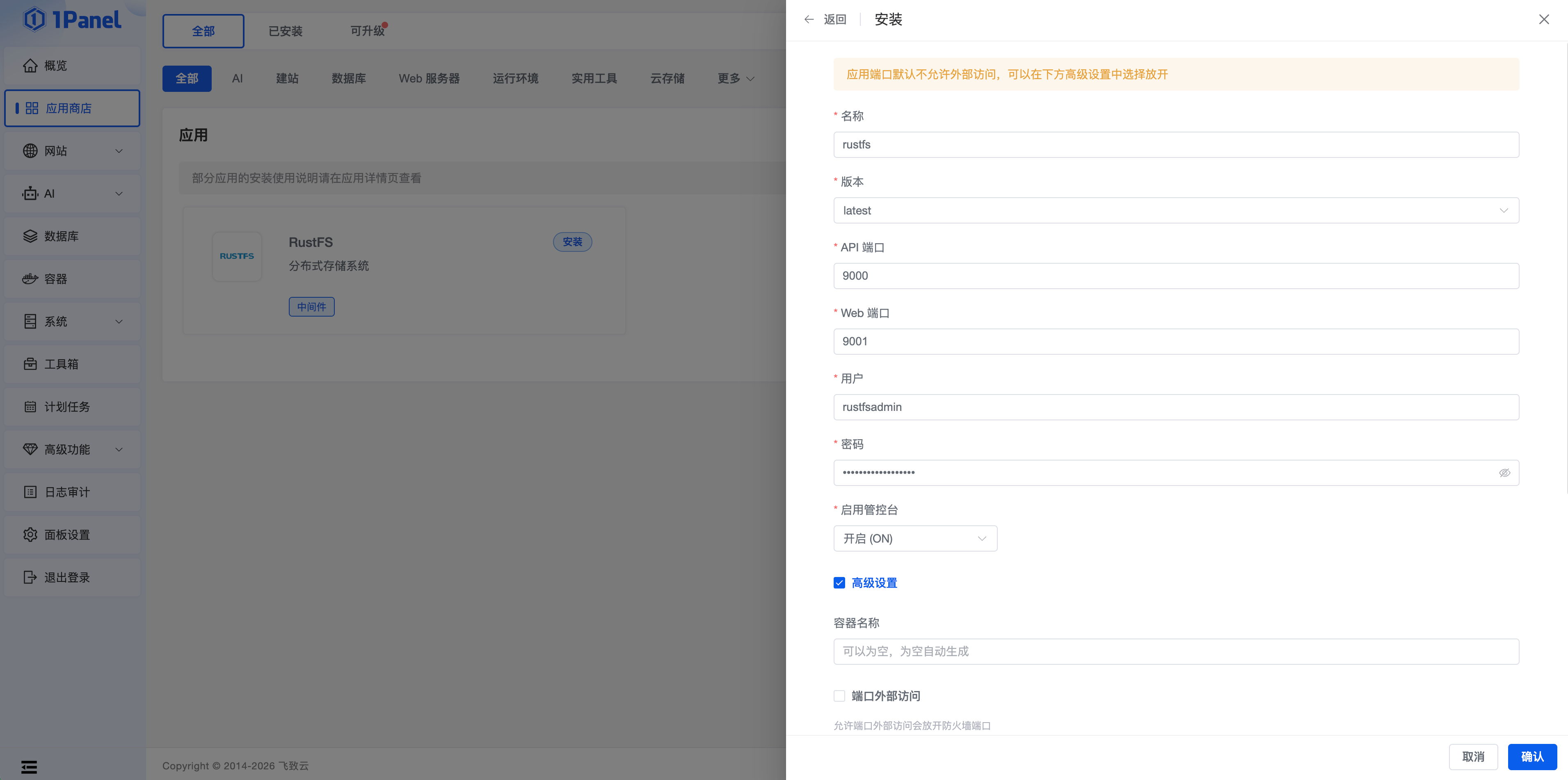 在 1Panel 的应用商店中直接搜索安装即可。根据需求自行调整具体参数,放开外部端口等,非常简单不再赘述。