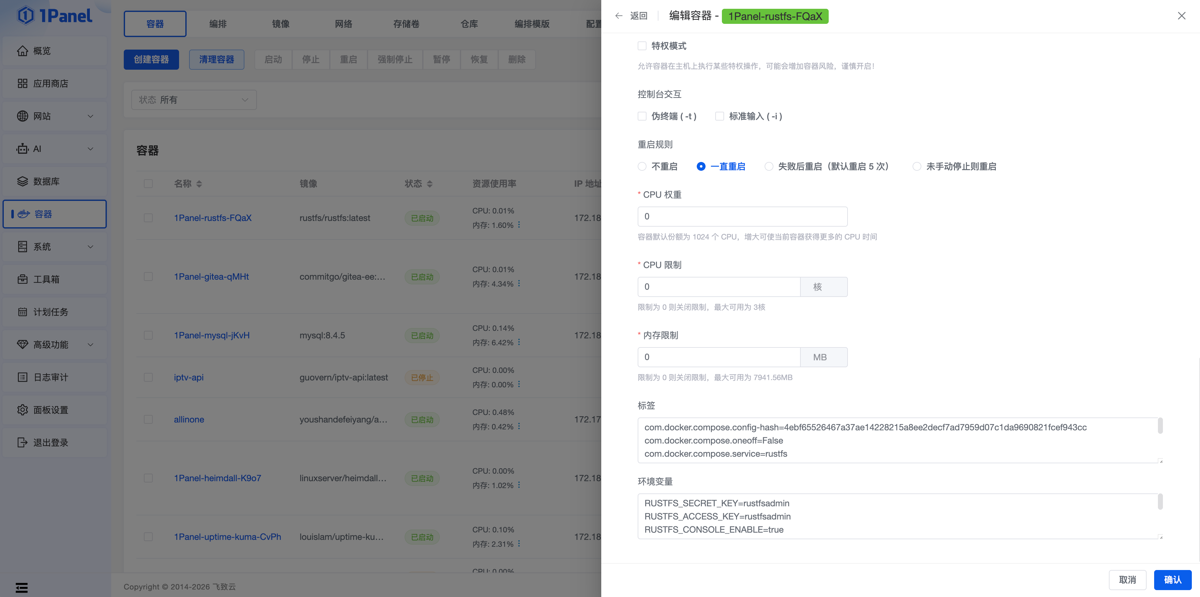 安装成功后,在 1Panel 中选择容器,找到 RustFS 对应的容器,选择更多、编辑,能看到环境变量中有登录所需用户名和密码,可根据需求更改。