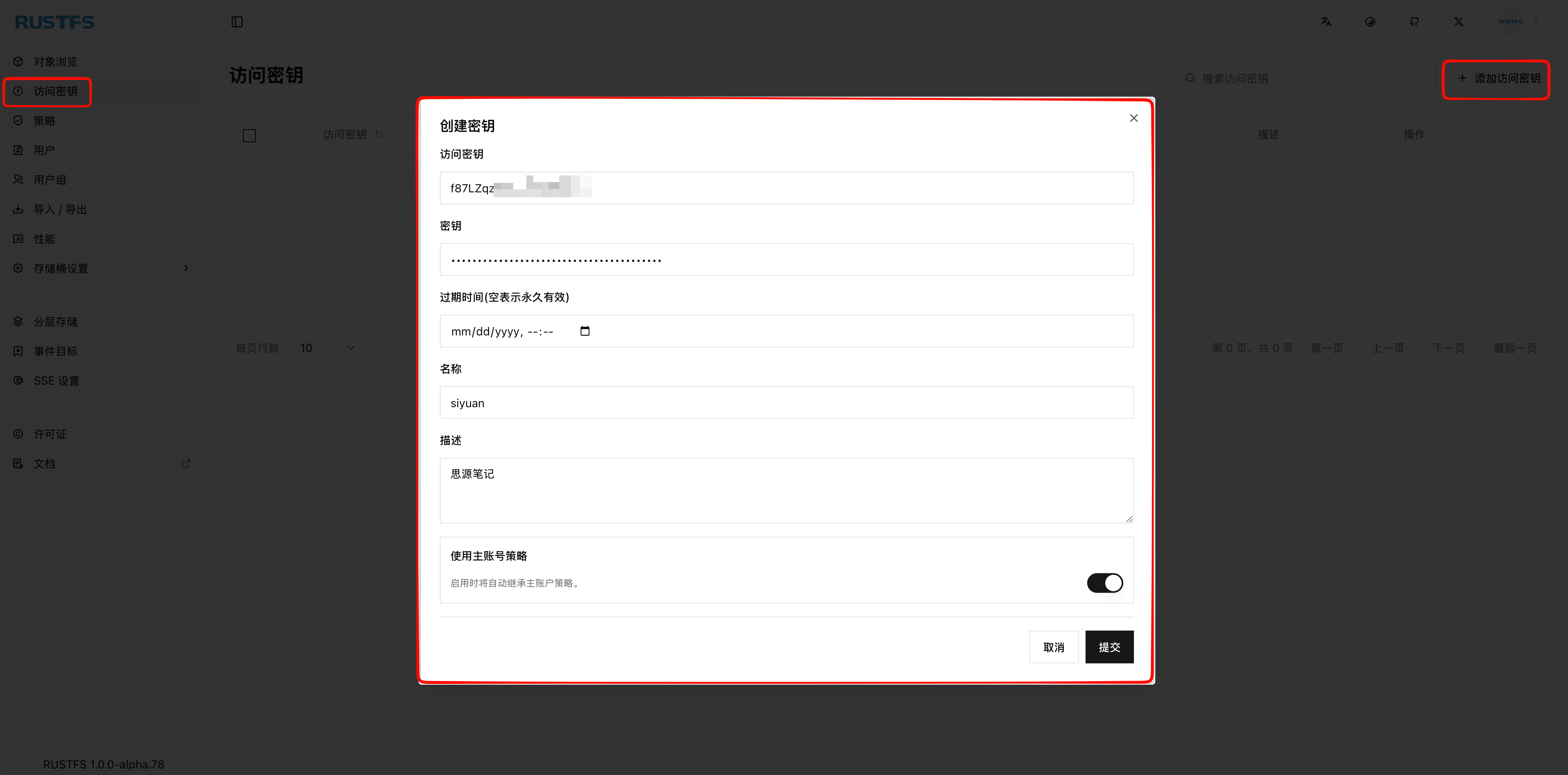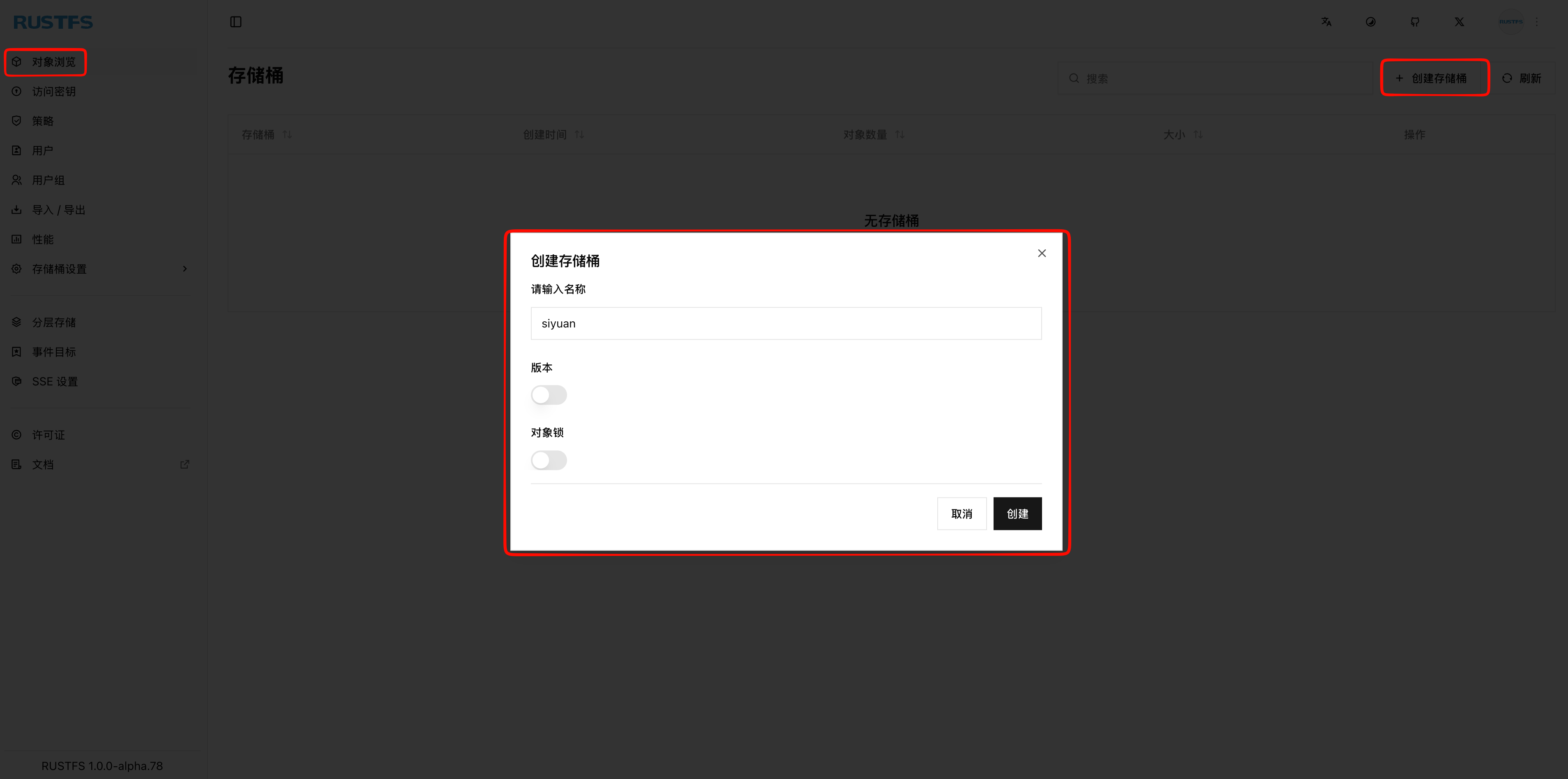 浏览器输入地址:9001 端口即可打开 RustFS 的 Web 管理界面,使用上述用户名密码登录。
