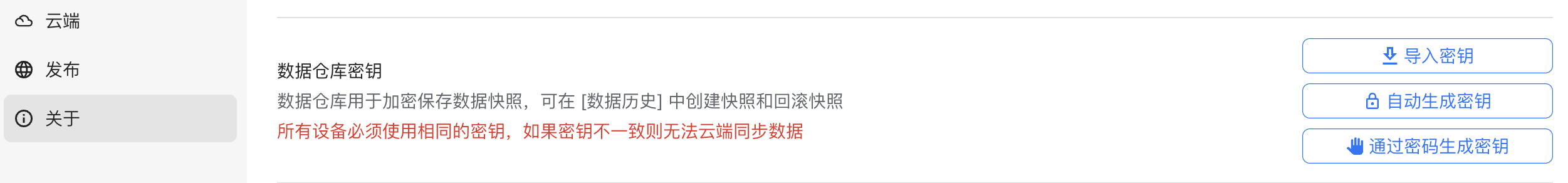在设置-关于 中配置数据仓库密钥。所有设备务必使用相同密钥。