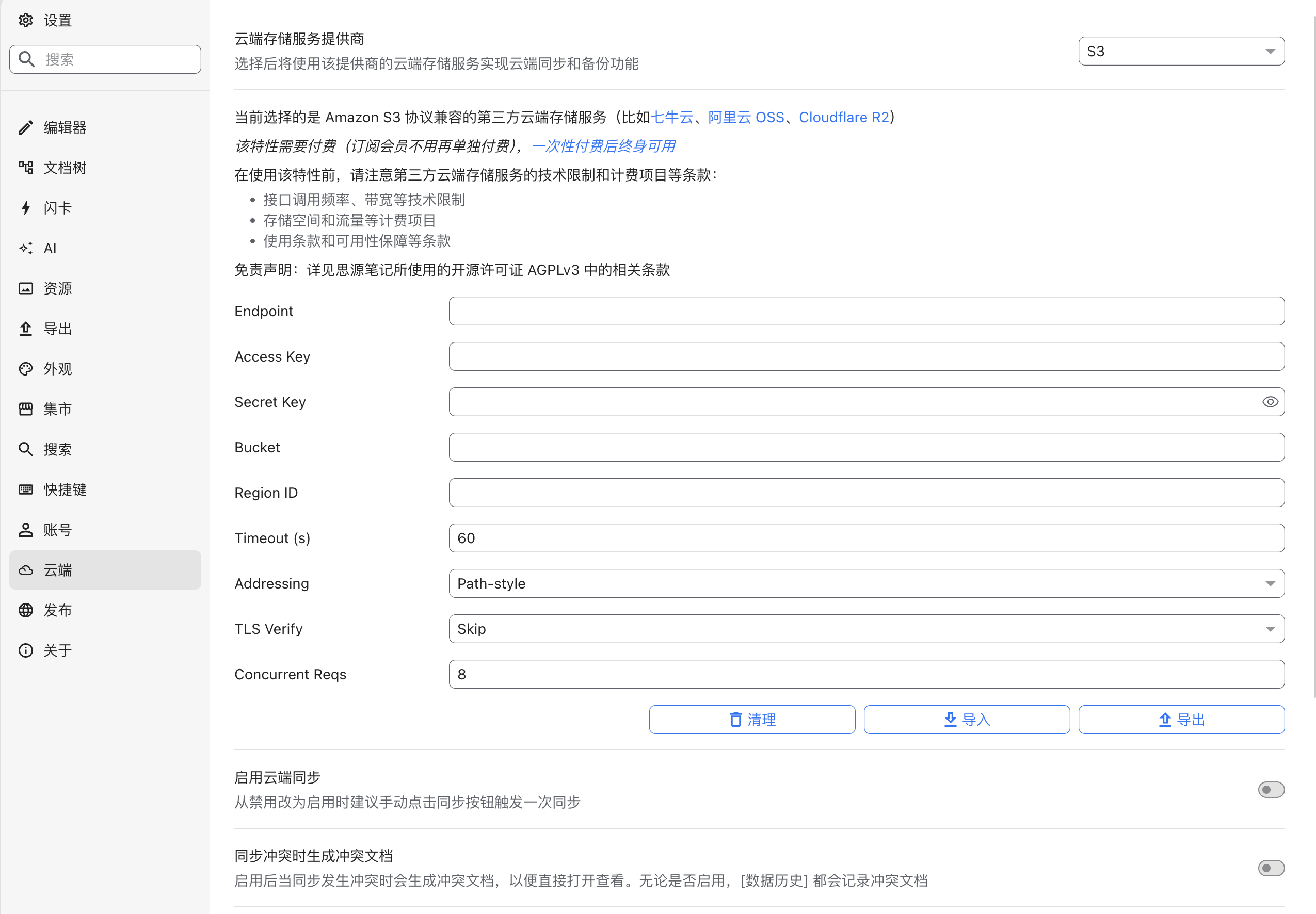 在设置-云端 中填写上文的 S3 相关配置参数。