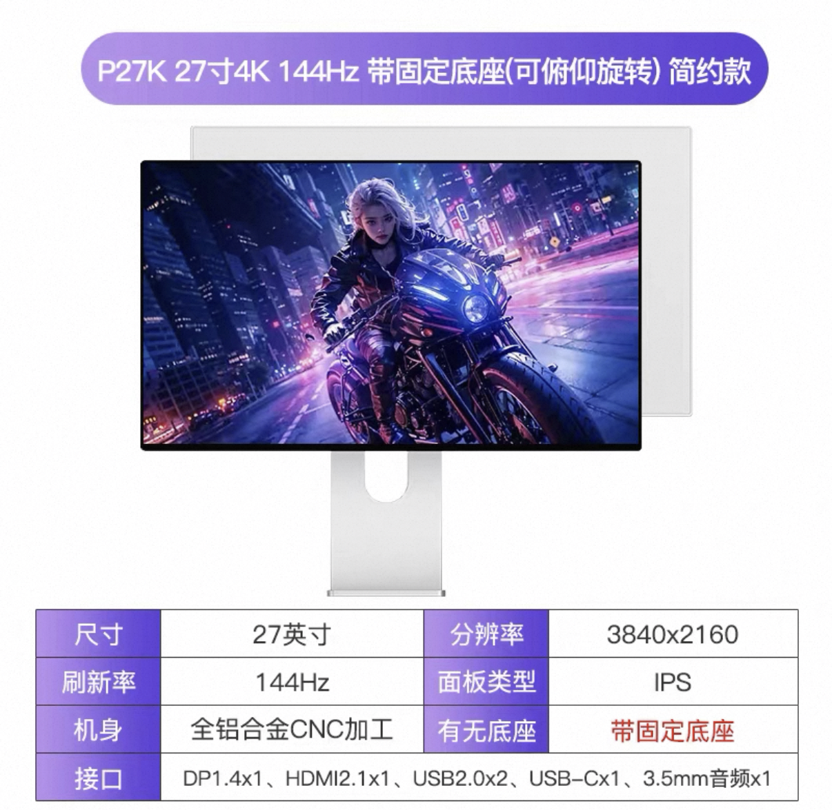 Kuycon P27K 27 寸 4K 144Hz 固定底座可俯仰调节 简约背板 淘宝日常价格约 2500 元